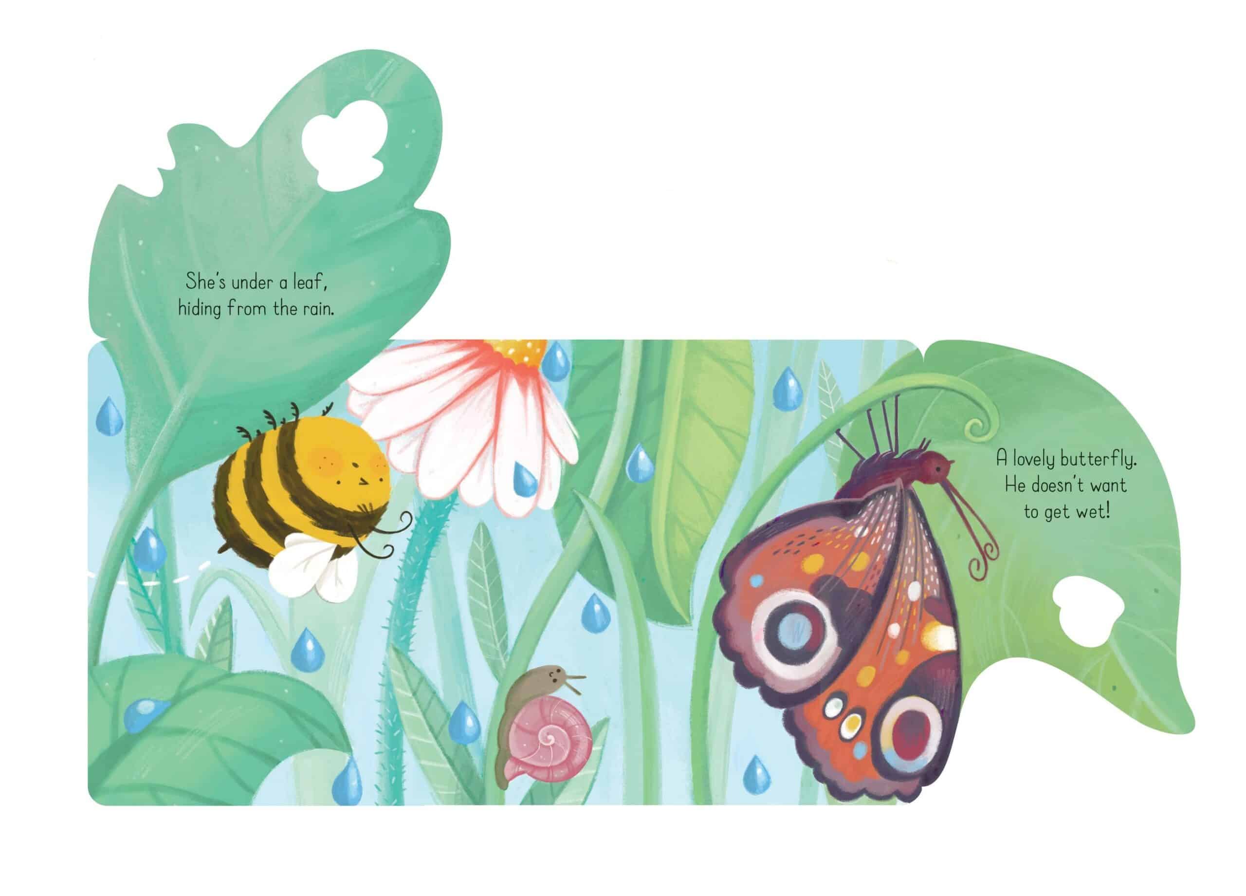 In fiecare pagina, copii vor intalni un paianjen care tese o panza, un fluture care cauta adapost de ploaie, pui de pasari care invata sa zboare si o familie de albine harnice, toate acestea fiind reprezentate cu un farmec deosebit. Fiecare clapeta ascunde o surpriza, iar micutii vor fi incantati sa continue explorarea paginilor. Aceasta carte ilustrata este nu doar placuta pentru ochi, ci ofera si oportunitati pentru povestiri si discutii, ajutand la dezvoltarea vocabularului si imaginatiei copilului.