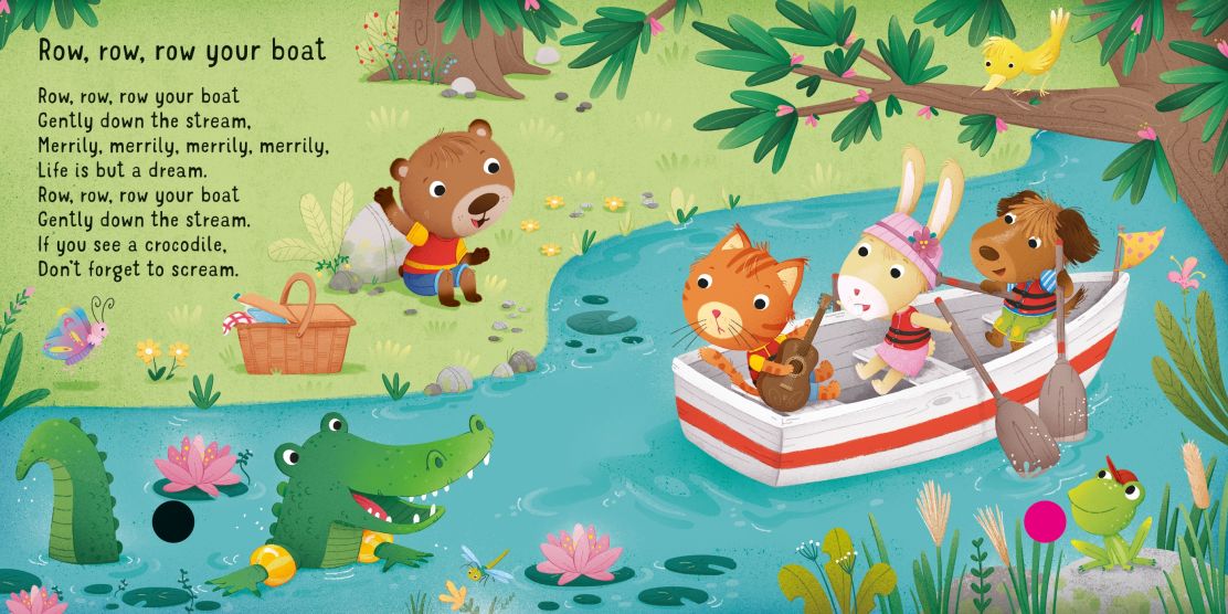 Aceasta carte interactiva pentru copii cuprinde sase cantece de leagan deosebit, incluzand titluri celebre precum „Old MacDonald,” „Twinkle Twinkle Little Star” si „London Bridge is Falling Down.” Fiecare pagina este insotita de butoane ce pot fi apasate pentru a reda melodiile, facilitand astfel un joc educativ si distractiv. Ilustratiile adorabile din carte, create de artista Laura Giorgi, aduc la viata personaje de animale fermecatoare, atragand atentia celor mici si stimulandu-le imaginatia.