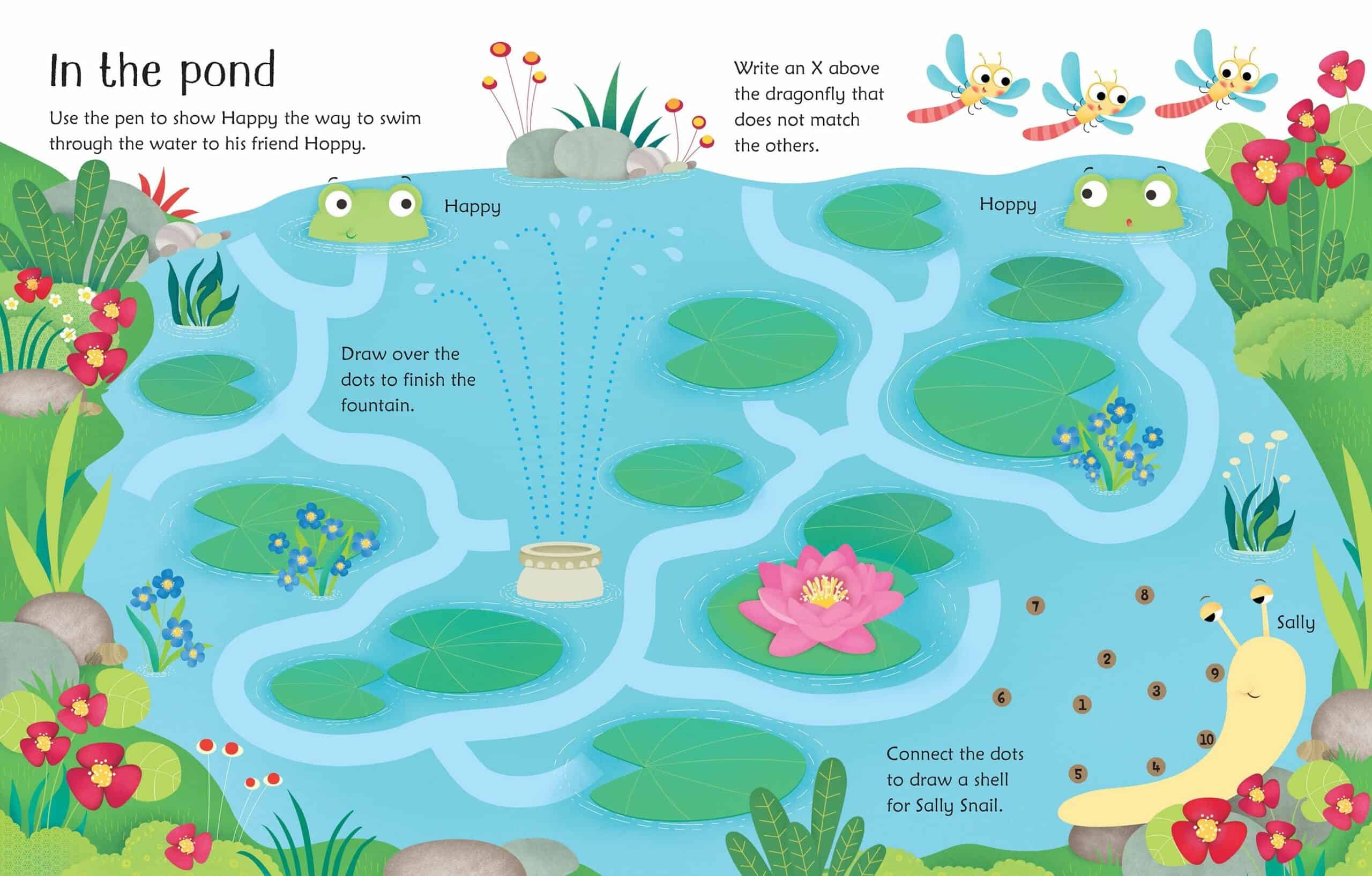 „Wipe-Clean Garden Activities” contine 24 de pagini vibrant ilustrate, fiecare umpluta cu activitati care includ identificarea insectelor, labirinturi cu flori si provocari de desenat. Suprafata speciala a paginilor permite stergerea usora a activitatilor completate, astfel ca micutii pot reveni mereu la ele pentru a exersa din nou, facand din aceasta carte un instrument excelent pentru invatarea prin repetitie. Fiecare pagina este conceputa sa stimuleze imaginatia si curiozitatea, oferind o experienta senzoriala unica.