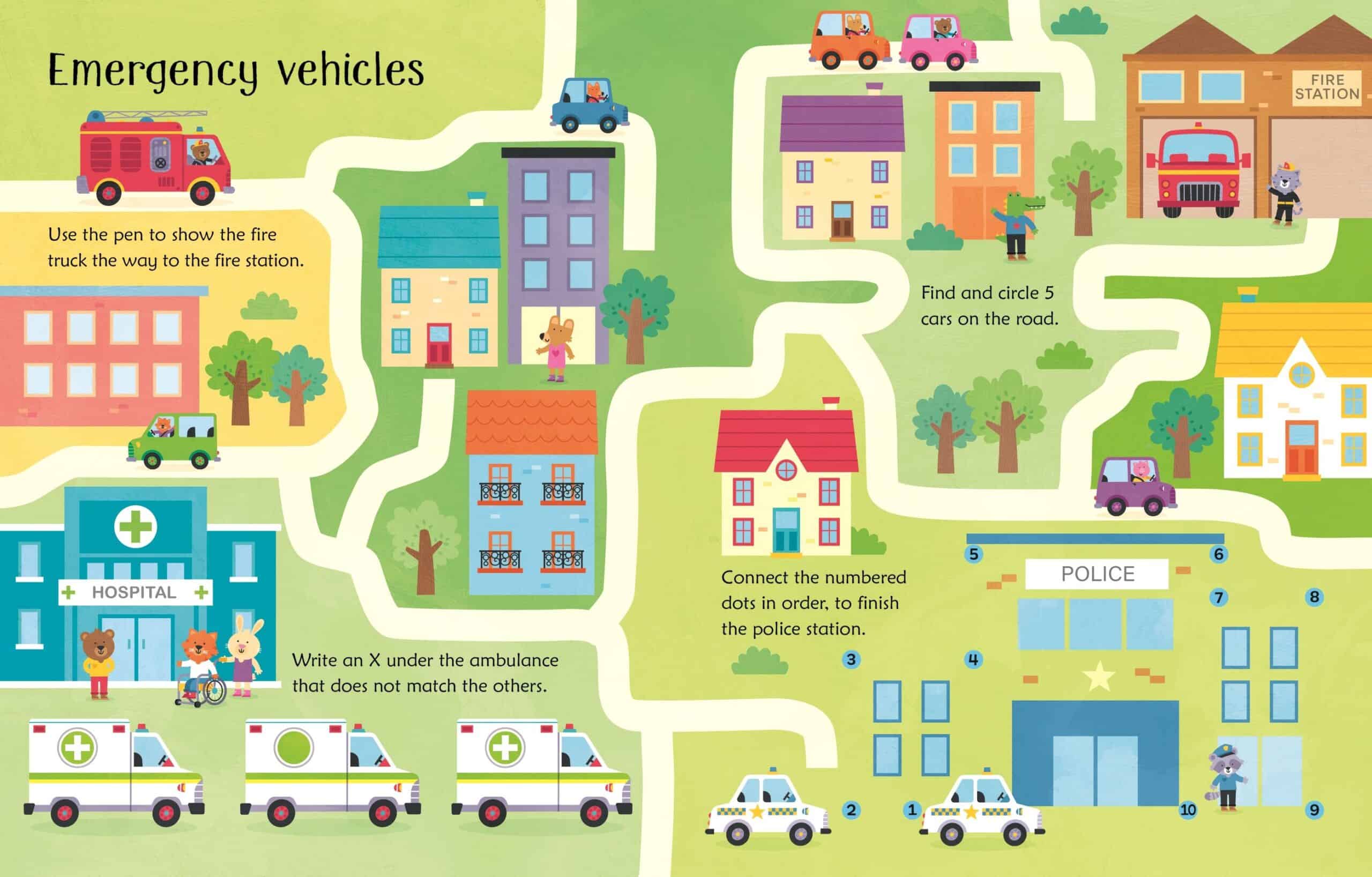 „Wipe-Clean Things That Go Activities” include o gama diversificata de activitati legate de vehiculele si mijloacele de transport, de la masini si trenuri, la avioane si barci. Micutii vor descoperi jocuri de potrivire, labirinturi provocatoare, exercitii de numarare, dar si provocari de observare care le cer sa gaseasca diferentele dintre imagini. Toate aceste activitati sunt menite sa dezvolte abilitatile motorii fine, coordonarea ochi-mana si capacitatea de a gandi logic.